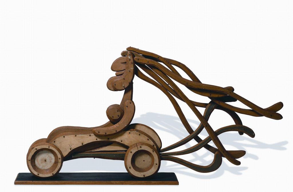 À partir de matériaux pauvres glanés ici et là, il crée une œuvre singulière, empreinte de cocasserie et d’ingéniosité.